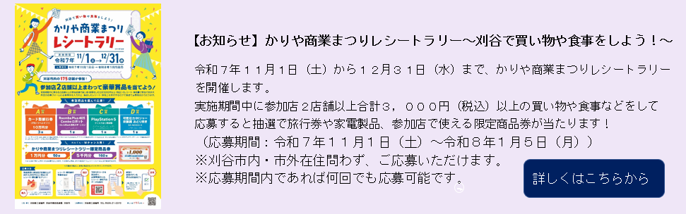 【お知らせ】かりや商業まつりレシートラリー(実施期間:11/1~12/31)New!!