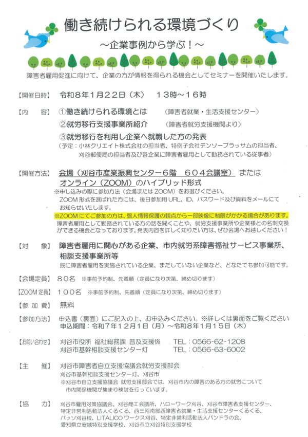 【受講者募集】障害者雇用セミナー 働き続けられる環境づくり~企業事例から学ぶ!~New!!