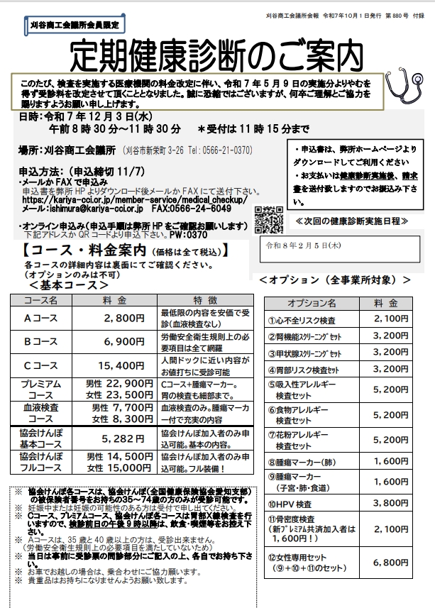刈谷商工会議所では会員企業の従業員、またはそのご家族のために定期健康診断を実施しております。