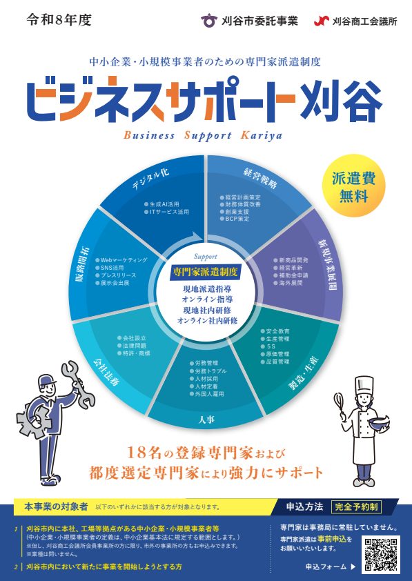主に刈谷市に拠点を置く中小企業のうち、店舗や企業の経営者、責任者、創業者の方にご利用いただけます。相談は無料、業種も問いません。まずはお気軽にお問い合わせください。